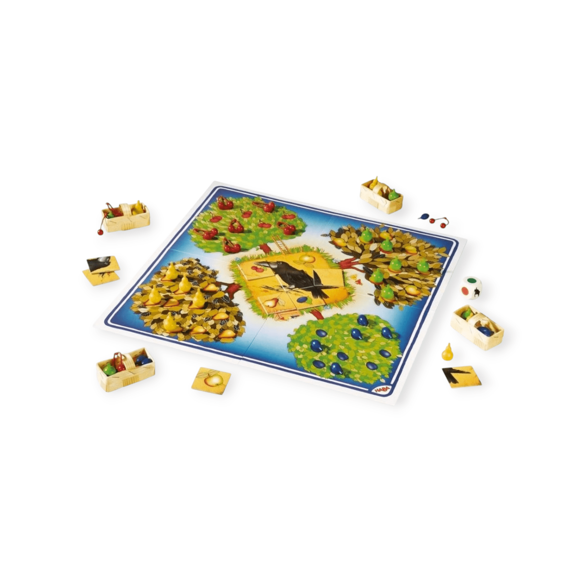 Reife Kirschen, knackige Äpfel, saftige Birnen und köstliche Pflaumen laden zum Ernten ein – doch Vorsicht, der freche Rabe hat ebenfalls ein Auge auf die leckeren Früchte geworfen!