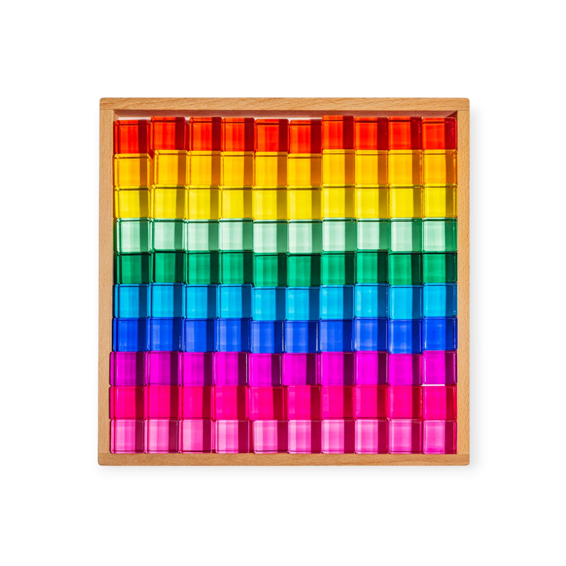 Entdecken Sie die Ines Blocks – ein schillerndes Set aus 100 transparenten Acrylwürfeln in leuchtenden Regenbogenfarben, das Mathematik und freies Spiel auf magische Weise verbindet.